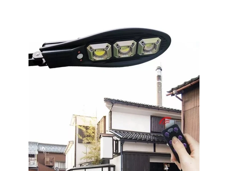Комплект 2бр. СОЛАРНА УЛИЧНА ЛАМПА 345W е изцяло автономна и водоустойчива соларна лампа!  През светлата част на деня батерията се зарежда, като веднага след като се стъмни осветлението се включва автоматично, благодарение на сензорна клетка за външна осветеност, които са в соларния панел. Соларната улична лампа е интелигентна система за външно осветление, която интегрира най-добрите енергоспестяващи части – фотоволтаичен панел, осветително тяло, сензор, контролер и литиева батерия, всичко това в една кутия. Лампата е влагозащитена и подходяща за външен монтаж за осветление на: пътища, паркове, градини, вили, къщи, дворове, външен паркинг, както и навсякъде, където липсва електрозахранване или има нужда от автономно осветление. Идеална за комбиниране с КАМЕРА ЗА ВЪНШЕН МОНТАЖ През деня високоефективният слънчев панел събира енергия от слънцето и я съхранява в усъвършенстваната литиева батерия. През нощта мощният светодиод автоматично ще се включи, за да осигури светлина. Опция за светене когато се установи движение, COB ще увеличи яркостта, за да осигури изобилие от допълнително осветление за всеки в района. След 20-30 секунди или когато движението вече не е открито, светлината ще се изключи, за да спести енергия. Тази интелигентна функция позволява на соларната лампа, захранвана от слънчева енергия, да спестява енергия, когато никой не е в обхват и няма необходимост от светлината, което означава много по-дълго време на работа, отколкото бихте очаквали от подобно соларно осветление. Предимства на соларните лампи: добра стабилност и здравина водоустойчивост дълъг живот на батериите висока ефективност на светлината от COB диода и лупата лесен монтаж и поддръжка, високи показатели за безопасност, икономия на енергия и защита на околната среда. икономично и практично предимство. Характеристики: COB мощност – 345W Батерия – Li-ion Площ на осветяване – 100 кв.м Височина на монтиране – 3-5m (препоръчителна) Препоръчително разстояние между лампите -12m Размери – 48см/15см  Защита – IP65 Цвят светлина – 6000 К Made for Europe  Комплекта включва: 2бр Соларна лампа 345W  2бр Дистанционно управление Крепежни елементи Гаранция 24м.