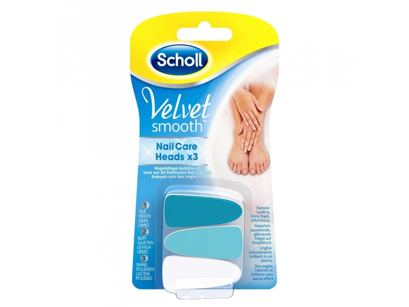 Комплект от 3 броя накрайници за електрическа пила за нокти "Velvet Smooth" :Те са с различна пилеща повърхност, като всеки е предназначен за отделните фази при оформянето на маникюр и педикюр.Приставката с тъмно син цвят е за скъсяване на ноктите и придаване на желана форма.Светло синият накрайник е необходим за изравняване на неравностите и несъвършенствата и изглаждане на повърхността на нокътните плочки.Приставката с бял цвят е с най-фина повърхност и е подходяща за полиране на ноктите, като по този начин им придава красив здравословен блясък.Начин на употреба : Отстранете предпазната капачка на електрическата пила.Поставете тъмно синия накрайник, за да придадете на ноктите си желаната форма и да почистите загрубялата кожа.Включете пилата, като плъзнете копчето за включване напред.Изберете една от двете степени на работа.Движете пилата бавно и внимателно само в една посока.След като сте оформили ноктите си, изключете пилата и сменете накрайника.Поставете светло синята приставка, за да изравните неравностите и несъвършенства по ноктите и загладите повърхността на нокътната плочка.Забършете пръстите си с кърпа.След това, по същия начин, като за финал поставете белия накрайник и полирайте повърхността на ноктите с кръгови движения.Натиснете леко за по-добри резултати.