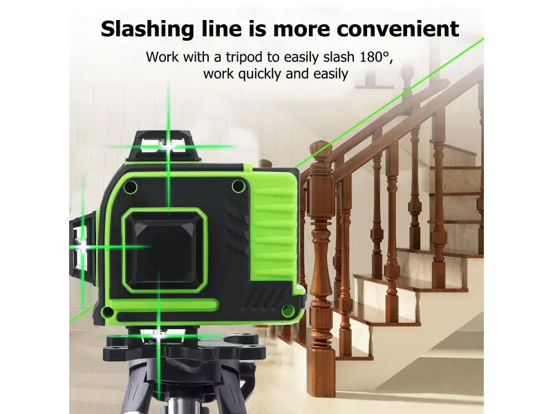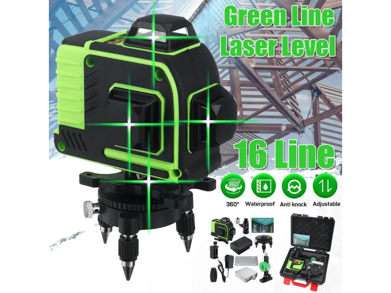 ХАРАКТЕРИСТИКИ:16 линии4 равнини (4 лазера)Лазер клас 2 530nm (зелен)Минимално отстояние на хоризонталния лъч от пода 7 ммРаботен обхват 30 мСтепен на защита: IP54 влагоустойчив и прахоустойчивБатерия 3.6V 6000mAh (литиево йонна) – време за работа до 16 часаРазмери 130 мм/80мм/135 ммТочност 1 мм при 7 мВреме на работа 12 – 16 часа работен обхват: 30 мВъзможност за включване и изключване на линиите по отделно, от нивелира или чрез дистанционно.Възможност за работа с адаптер, когато батериите се изтощят.Работен обхват 3 градуса (При по голям ъгъл от 3 градуса нивелира издава звуков сигнал за невъзможност за нивелиране)Има възможност за изключване на тази аларма и заключване на лазерния лъч при необходимост от линия която да не бъде нивелирана, а под някакъв градус КОМПЛЕКТЪТ ВКЛЮЧВА:Дистанционно управлениеДве батерииДържачМагнитна стойка за стенаМетална планкаСтойка за повдигане от под (разтягаща се)ТриподКонектор за стативЛинеен конектор за стативЗарядноКуфарчеСтойка за повдигане от под (разтягаща се тринога)