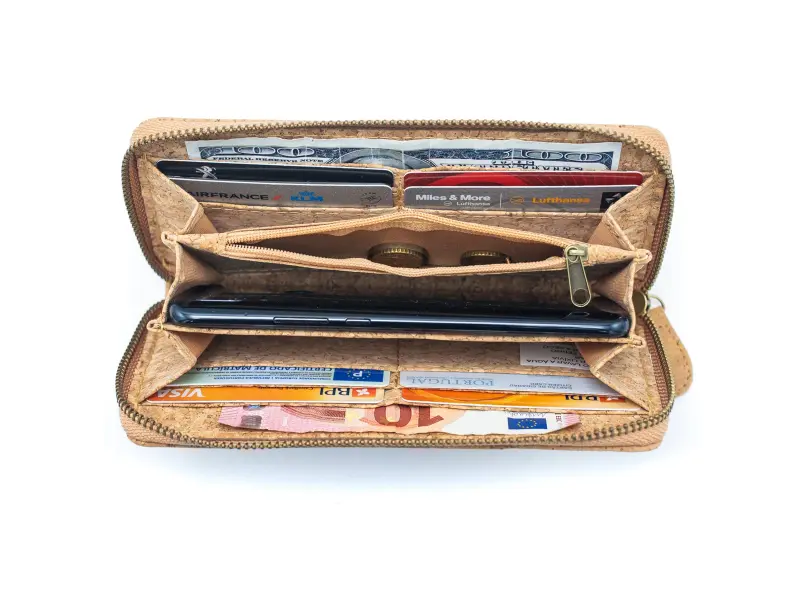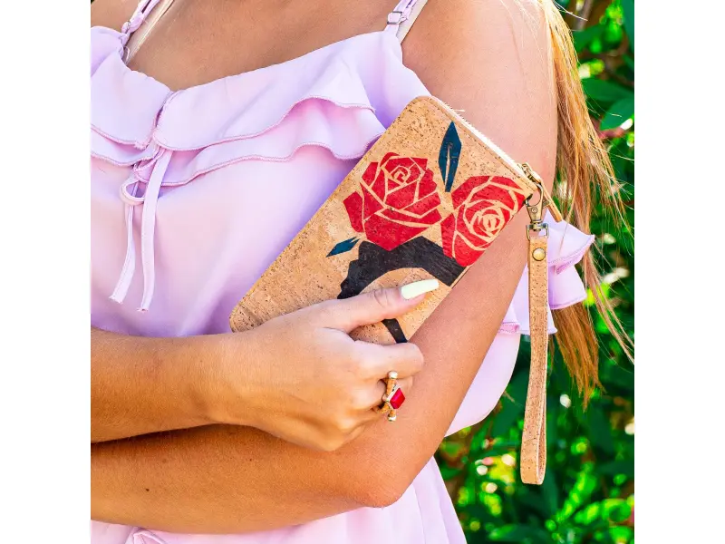 Корково портмоне с абстрактна картина Интересно дамско портмоне с мотиви. Разполага с отделения за банкноти, монети и телефон. Портмонето е и с удобна дръжка за ръка.