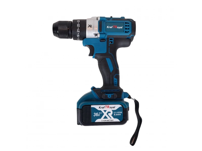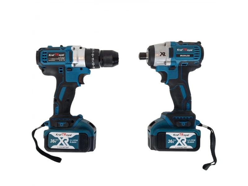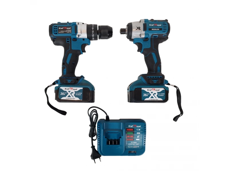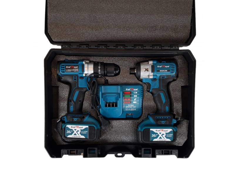 Акумулаторни безчеткови импакт  и винтоверт 36V 8AH в куфар KRAFTROYALХарактеристики на Импакт :Напрежение: 36 VКапацитет на батерията: 8.0 AhВид на батерията: Li-IonВид на мотора: безчетковМакс. въртящ момент: 120 NmНиско тегло и изключителна ударна сила.Компактният и лек дизайн осигурява отлично управление и маневреност при работа с инструмента.Ергономичната ръкохватка с меко гумено покритие осигурява по-удобна работа и по-голям контрол.Вградена светодиодна подсветка с функция за допълнително осветяване.Удобен пусков ключ, който спомага за намаляване на умората на пръстите при продължителна работа с инструмента.Подобрена система за защита от прах и влага, подходяща за използване на уреда при тежки условия на работа.Три степени за избор ма мощността на ударно завинтване.Индикатор за състоянието на акумулаторната батерия.Характеристики на винтоверта:Напрежение на акумулаторната батерия: 36VКапацитет на батерията: 8000 mAhMax. въртящ момент: 72 NmПатронник: До 13 ммОбороти: 0 – 650 r/minОбороти: 0 – 2000 r/ minТегло: 2.3 кг Подходящ за всякакви ремонтни дейности.Три режима на работа : пробиване, ударно пробиване, завиване на винтове.16 степенно регулиране на момента в режим винтовертРеверс на посоката на въртене (ляв / десен ход).Гумирана ергономична ръкохватка за по добър захват при работа.Самозатягащ метален патронник за лесна смяна на принадлежностите.Електронно регулиране на оборотите.Комплектът съдържа:1бр. Акумулаторен импакт1бр. Акумулаторен винтоверт2бр. Акумулаторни батерии1бр. Зарядно1бр. куфар