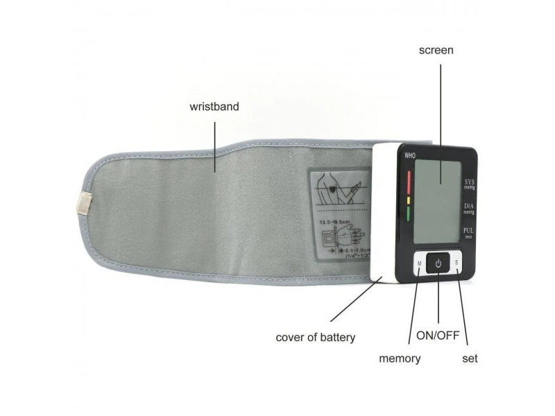 Апарат за измерване на кръвно налягане BABYLY BLMP-29 Автоматичният апарат BABYLY BLMP-29 е предназначен за бързо измерване на кръвното налягане и пулса. Това е нов модел на пазара. Неговата основна отличителна черта от аналозите е голям LCD (47×39 мм) дисплей с големи числа (11×6 мм) и отличен контраст. Хората с лошо зрение ще видят показанията на устройството. Самият той изпомпва въздуха и дава данните в цифров вид. Лесен и удобен за използване, особено ако живеете сами или любимите ви хора не винаги са у дома и трябва да измервате кръвното си налягане. Автоматичният UKC BABYLY BLMP-29 включва автоматизирана система от електрическа помпа и освобождаваща клапа за въздуха. При извършено измерване самото устройство се изключва. Характеристики: Тип: апарат за измерване на кръвно налягане – за китка Дисплей: LCD 47×39 мм Метод на измерване: осцилометричен метод Автоматично напомпване: (електрическа помпа) Автоматично освобождаване на въздуха: (освобождаващ вентил) Детектор за налягане: сензор за съпротивление на налягане Диапазон на измерване на налягането: 0 mm Hg-299 mmHg Диапазон на измерване на пулса: 40-200 удара / мин Коефициент на точност на налягането: ± 3 mm Hg. Отчитане на импулса: ± 5% Мощност: 3V Автоматично изключване след 60 секунди Захранване: 2 AAA батерии запаметява последните 90 измервания Комплекта включва: апарат BABYLY BLMP-29 – 1 бр. пластмасова кутия за съхранение – 1 бр. ръководство на английски език – 1 бр. картонена кутия – 1 бр.