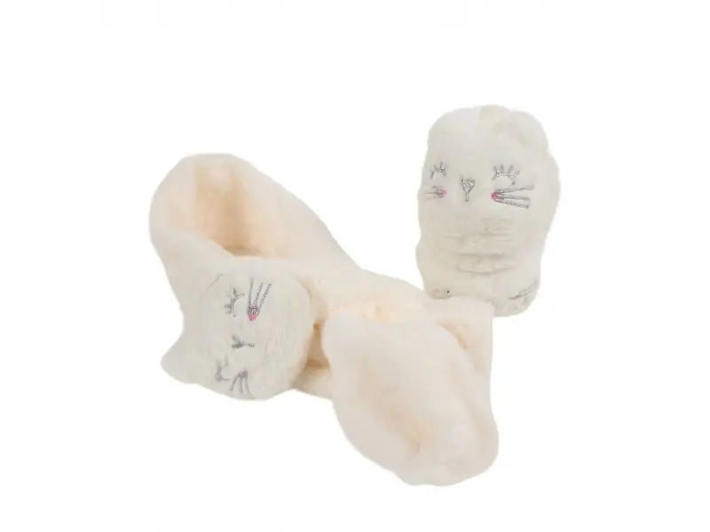 Ушанки с шал с коте в бял цвят - Плюшени детски ушанки. - Плюшен детски шал. - Мека и топла подплата. - Универсален размер.