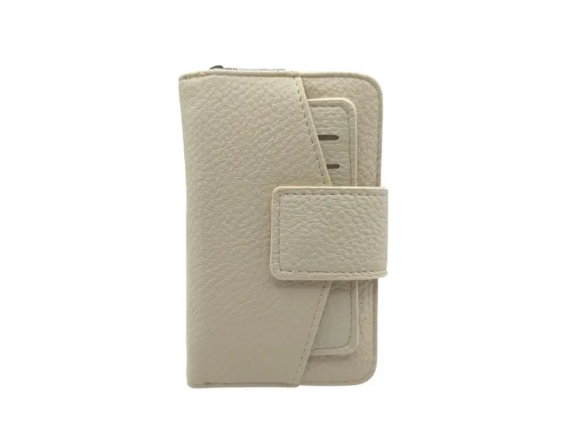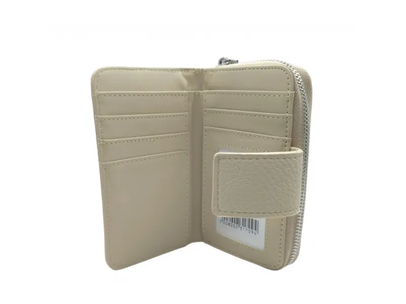 Бежово дамско портмоне с интересен дизайн от качествена изкуствена кожа. Практично дамско портмоне с удобни отделения за банкноти, карти и монети. Малко дамско портмоне с тик-так закопчаване.