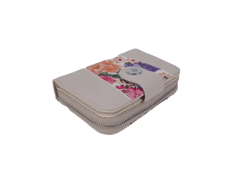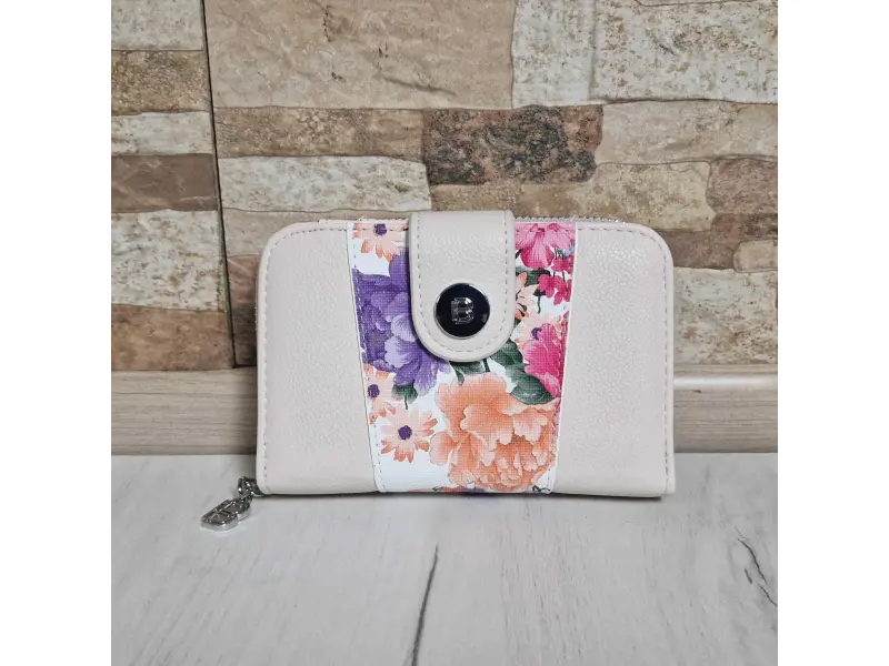 Удобно дамско портмоне с цветя - Дамско портмоне от еко кожа. - Закопчаване с копче тип магнит. - Отделения за карти и документи. - Отделение за банкноти. - Отделение за монети с цип. - Разположението на цветята може да бъде различно.