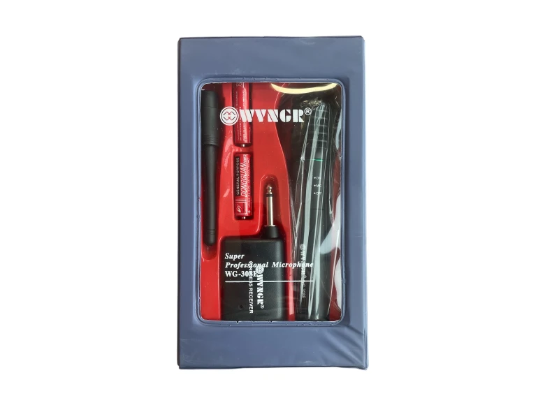 Безжичен микрофон WG-308E - професионален микрофон с високо качество на звука, подходящ за концерти, записи и публични изяви. Лек и удобен, осигурява безупречно предаване на сигнала на дълги разстояния. Перфектен избор за всички, които търсят надеждност и отлична производителност