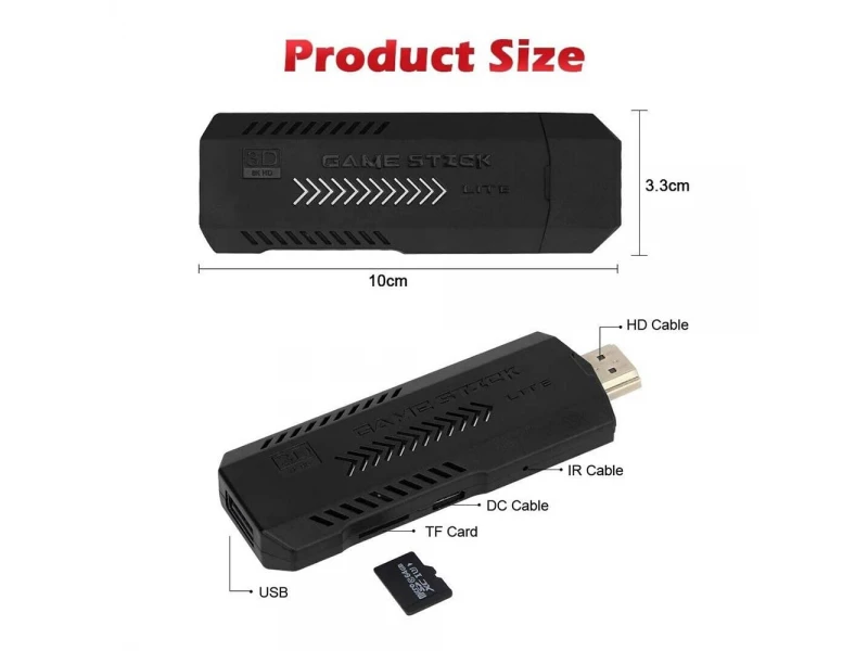 Описание на продукта:Повече от 40 000 вградени игриКонзолата предлага разнообразие от класически игри:Ретро аркадни игриЛогически и математически игриСпортни, пъзели, стрелба, екшънСъстезателни, бойни, стратегически и приключенски игриИгри с карти и много другиСъвместимост с различни устройстваПодходяща за 8K Ultra HD телевизори, монитори, проектори и компютриВръзка чрез HDMI изход за висока разделителна способностПодобрена производителностОборудвана с RK3128 процесор за бързо зареждане и гладко гейминг изживяванеПоддържа 9 емулатора, включително: MAME, PS1, GB, GBA, GBC, MD, SFC, FC и ATARIОсновни функции на менютоСписък на игрите: Преглед на всички налични игриКласификация: Идентифициране на игри по емулаторИстория: Записва последно играни игриЛюбими игри: Добавяне на предпочитани игри в отделен списъкТърсене: Бързо намиране на игри по имеКонтролери с висока издръжливостБезжични контролери на 2,4 GHz за удобна играПротивоплъзгащи джойстици с дълготрайна издръжливостКомпактна и практичнаУдобен и скрит дизайн, подходящ за всяко помещениеЛесна за пренасяне и инсталиранеСъдържание на комплекта:2 x Безжични контролера1 x Game Stick X21 x USB кабел1 x TF карта с предварително заредени игри1 x Ръководство за потребителя