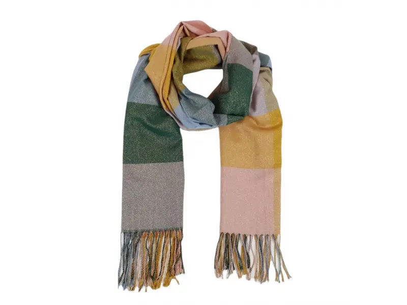 Шалът има блестящ ефект благодарение на металната нишка и интересна цветова комбинация.