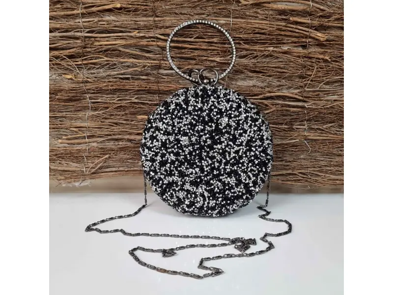 Черна блестяща кръгла чанта с черни и сребърни камъни. Елеганта чанта с едно отделение с метален кант, дълга дръжка тип верижка и допълнителна дръжка за ръка. Дамска чанта подходяща за абитуриентски бал, сватба или специално събитие..