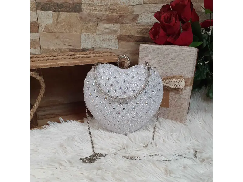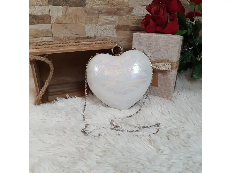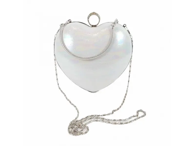 Бяла чанта с хамелеонов гръб във формата на сърце отваряща се с пръстен. Блестяща чанта с едно отделение със сребърен кант, дълга дръжка тип верижка и допълнителна дръжка за ръка. Дамска чанта подходяща за абитуриентски бал.