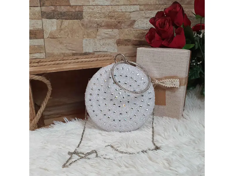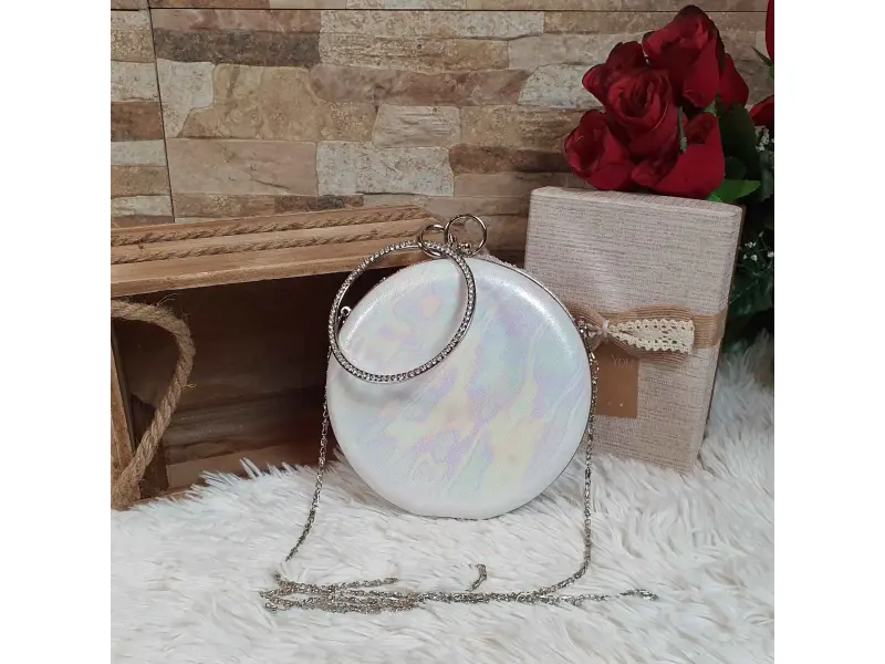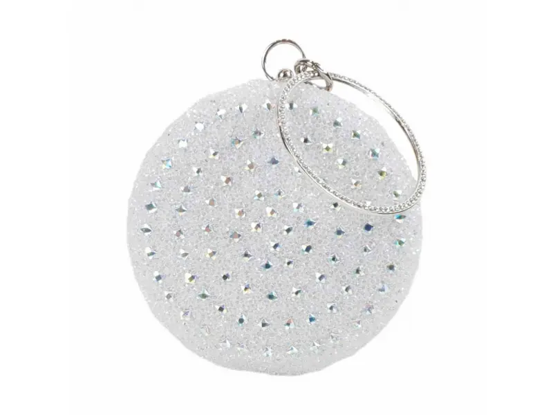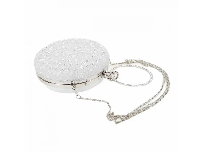 Блестяща кръгла хамелеонова чанта. Бална кръгла чанта в бял цвят с хамелеонов гръб. Модерна официална чанта с камъни подходяща за абитуриентски бал. - ePazar.bg
