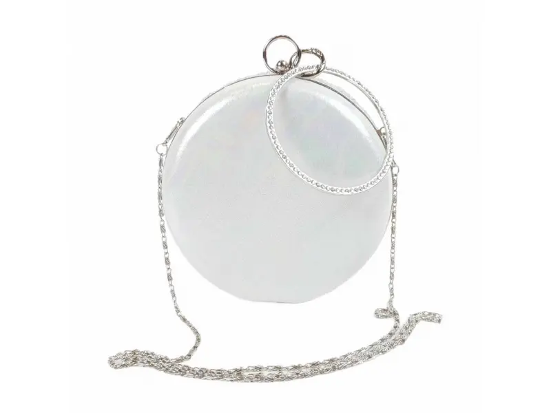 Бяла блестяща кръгла чанта с хамелеонов гръб. Официална чанта с едно отделение със сребърен кант, дълга дръжка тип верижка и допълнителна дръжка за ръка. Дамска чанта подходяща за абитуриентска бал.