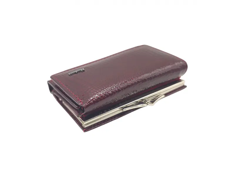 Малко лачено дамско портмоне с лаково покритие - Бордово портмоне от естествена кожа и лак. - Затваряне с копче тик-так. - Отделения за карти и лични документи. - Отделение за банкноти. - Монетник с щипка.