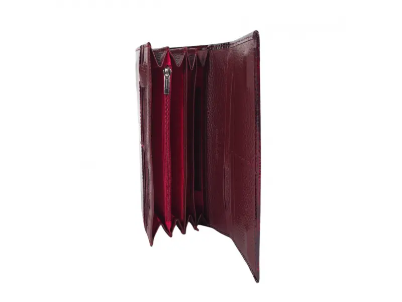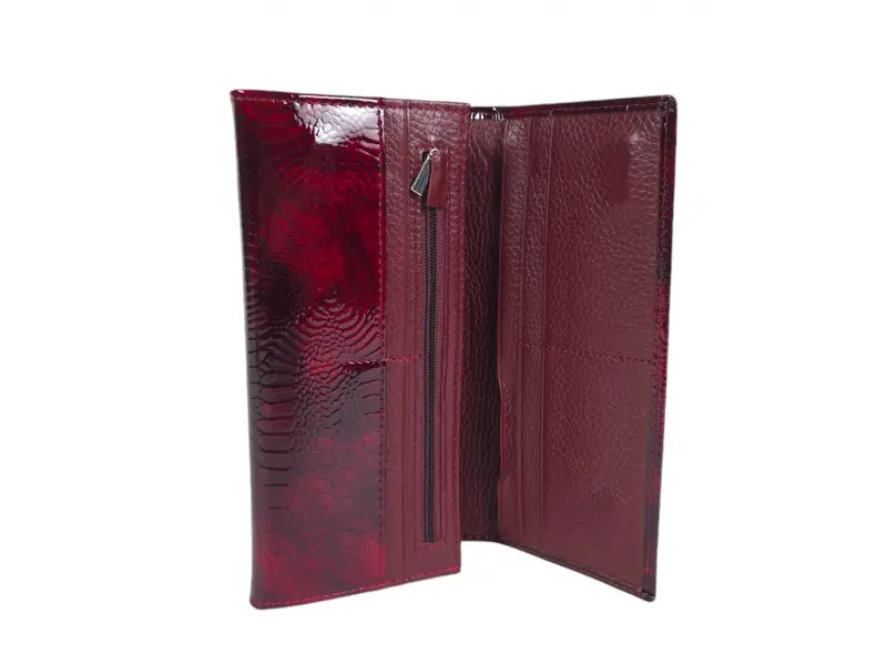 Бордово дамско портмоне от естествена кожа и лак. Голямо дамско портмоне с отделения за банкноти, слотове за карти и лични документи и монетник с цип. Голямо портмоне на добра цена.