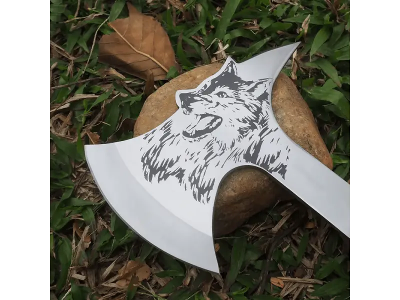 Тази брадва се отличава с уникално лазерно гравиране на вълк от двете страни, което ѝ придава индивидуалност и стил. Извитият ръб я прави универсална за различни приложения – от цепене на дърва до разкъсване на материали по време на оцеляване.