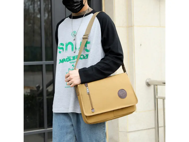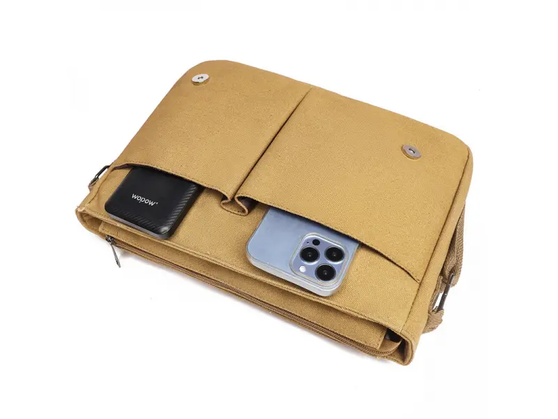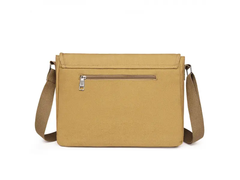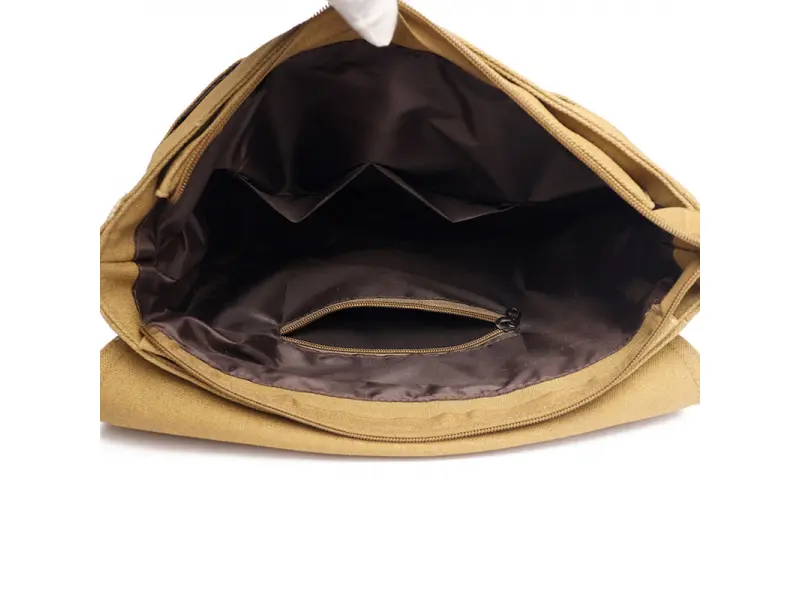 Качествена мъжка чанта от здрава и водоустойчива материя - брезент. Голяма мъжка чанта с едно основно отделение затварящо се с цип, вътрешно малко джобче, място за телефон и ключове, две предни отделения, отделение с цип и заден джоб с цип, дълга и стабилна регулираща се дръжка.