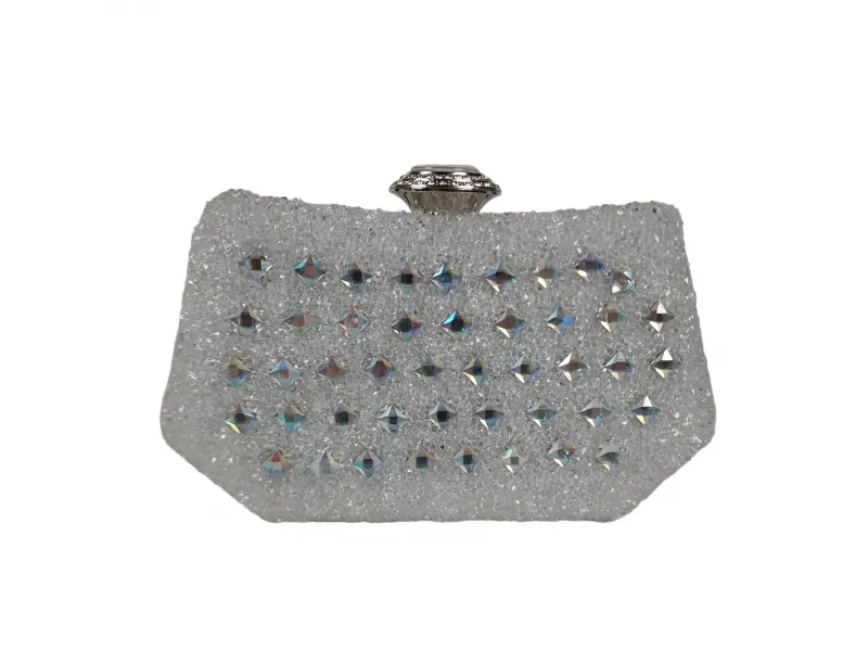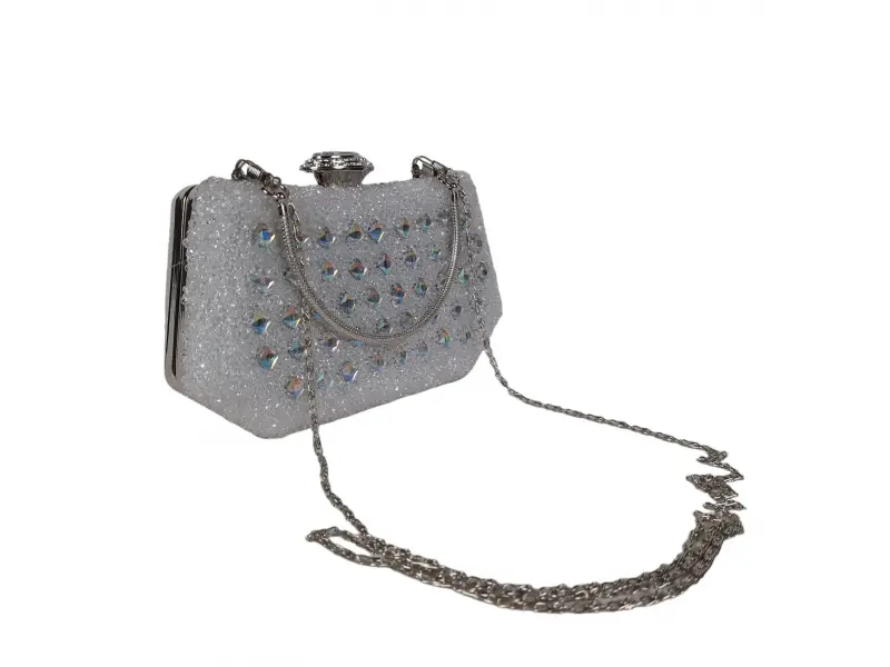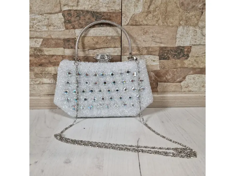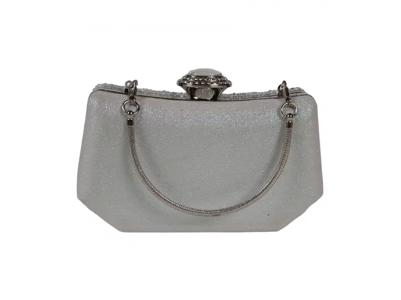 Бяла вечерна чанта - Официална дамска чанта с едно отделение. - Отваряне и затваряне с механизъм. - Сребърен кант. - Дръжка за носене в ръка. - Дълга дръжка тип верижка.