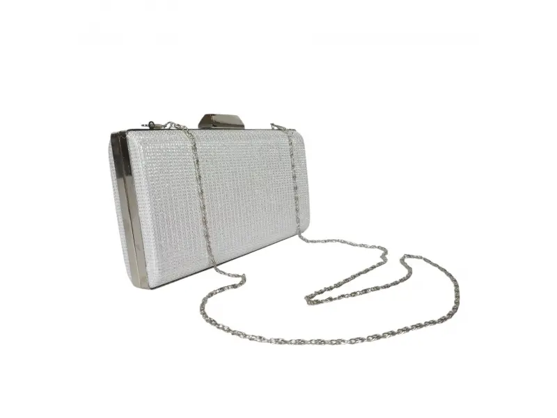 Елегантна чанта - Официална дамска чанта с едно отделение. - Отваряне и затваряне с механизъм. - Сребърен кант. - Дълга дръжка тип верижка.