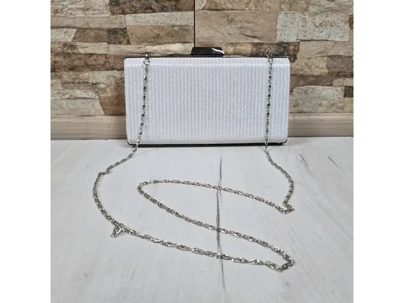 Стилна дамска чанта за официално събитие - абитуриенски бал, сватба. Голяма елегантна чанта в бял цвят с едно отделение с механизъм и дълга дръжка тип верижка.