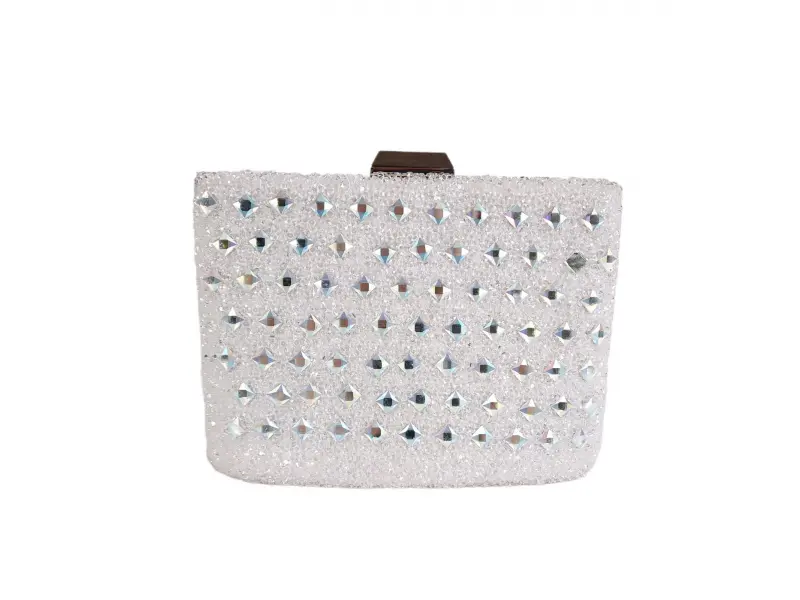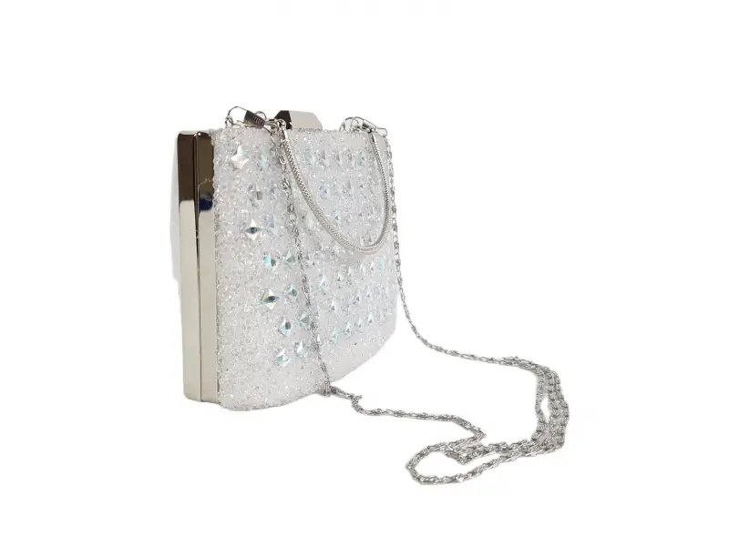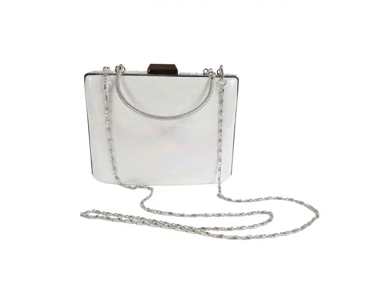 Елегантна чанта в бял цвят - Официална дамска чанта с едно отделение. - Отваряне и затваряне с механизъм. - Сребърен кант. - Дръжка за носене в ръка. - Дълга дръжка тип верижка.
