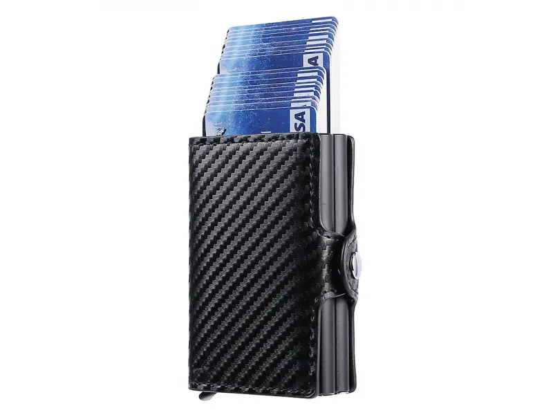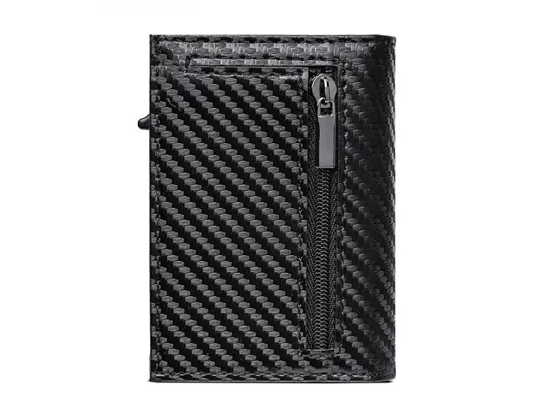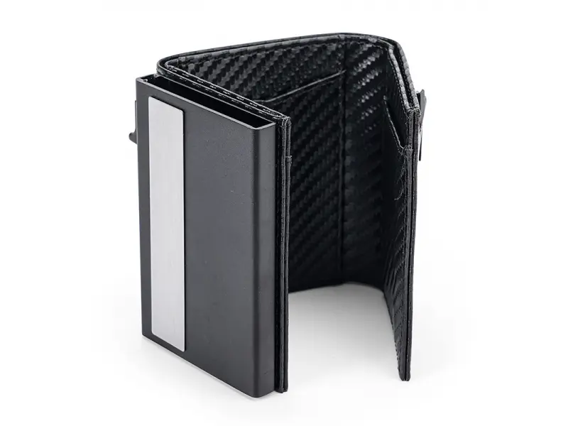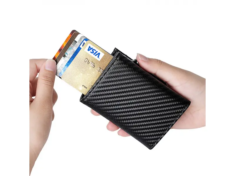 Стилен автоматичен държач за карти - Автоматичен държач за карти от карбон. - Алуминиева сплав с автоматично изваждане на карти. - Отделение за карти и лични документи. - Заден джоб с цип.