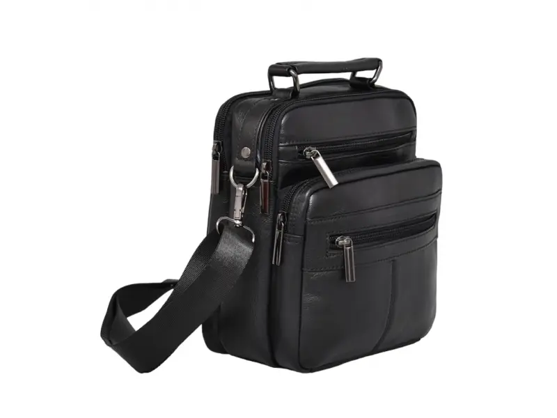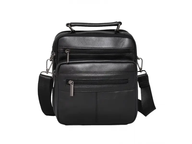 Мъжка чанта от качествена естествена кожа - Две основни отделения с цип. - Малък вътрешен джоб с цип. - Три предни джоба с цип. - Заден джоб с цип. - Регулираща се презрамка. - Дръжка за носене в ръка.