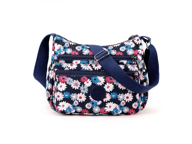 Синя дамска чанта от текстил с цветя - Дамска чанта от текстил. - Едно основно отделение с цип. - Три предни джобчета с цип. - Заден джоб с цип. - Два странични джоба. - Малък вътрешен джоб с цип. - Отделение за телефон и документи. - Регулираща се, дълга дръжка.
