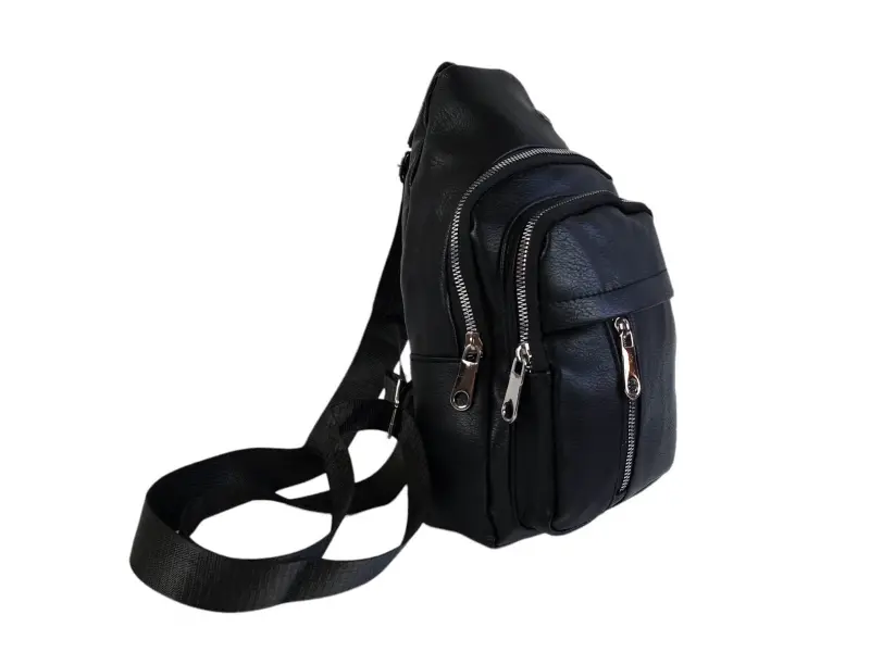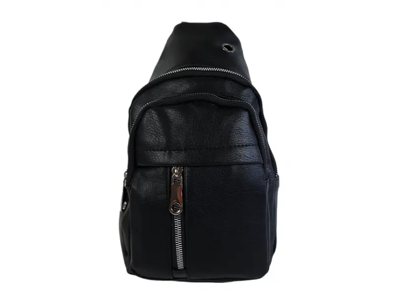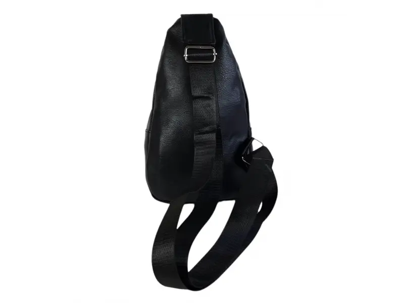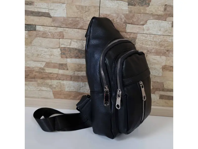 Мъжка чанта за през гърди от качествена еко кожа. Черна мъжка чанта, която може да се носи през гърди, рамо или гръб тип раница. Мъжка чанта с две основни отделение с цип, вътрешен джоб с цип, преден джоб с цип и регулираща се презрамка от полиестер.
