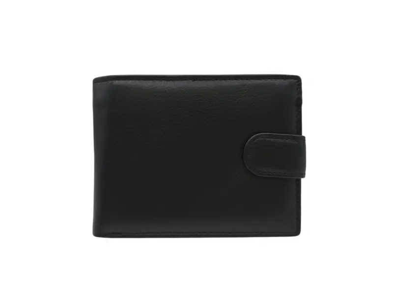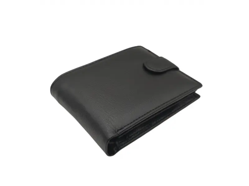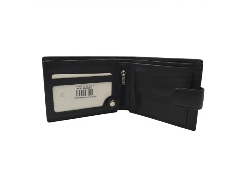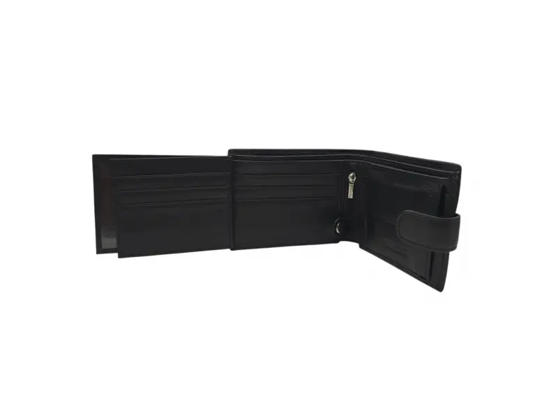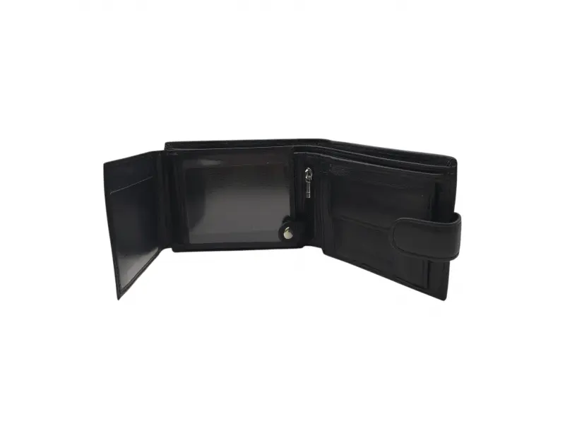 Мъжки портфейл от качествена ествествена кожа на ниска цена. Черен мъжки портфейл със закопчалка с удобно разпределение за банкноти, монети и лични документи.