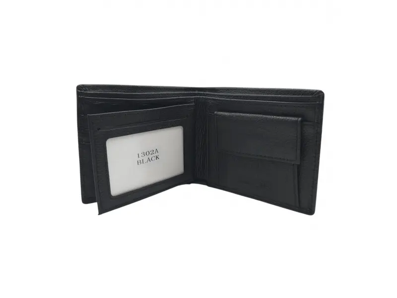 Удобен модел мъжки портфейл - Черен мъжки портфейл от естествена кожа. - Отделение за банкноти. - Слотове за карти и лични документи. - Отделение за монети.