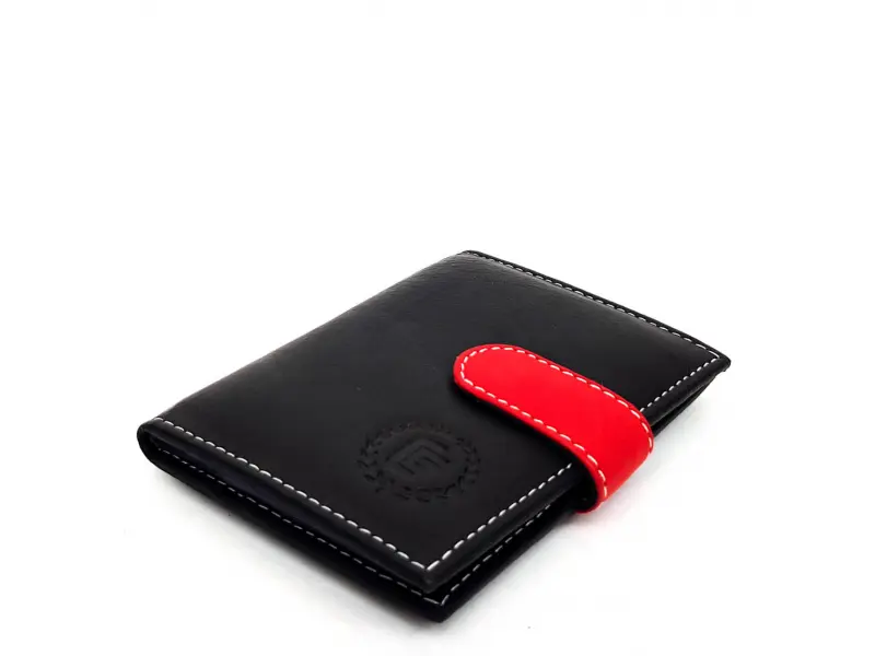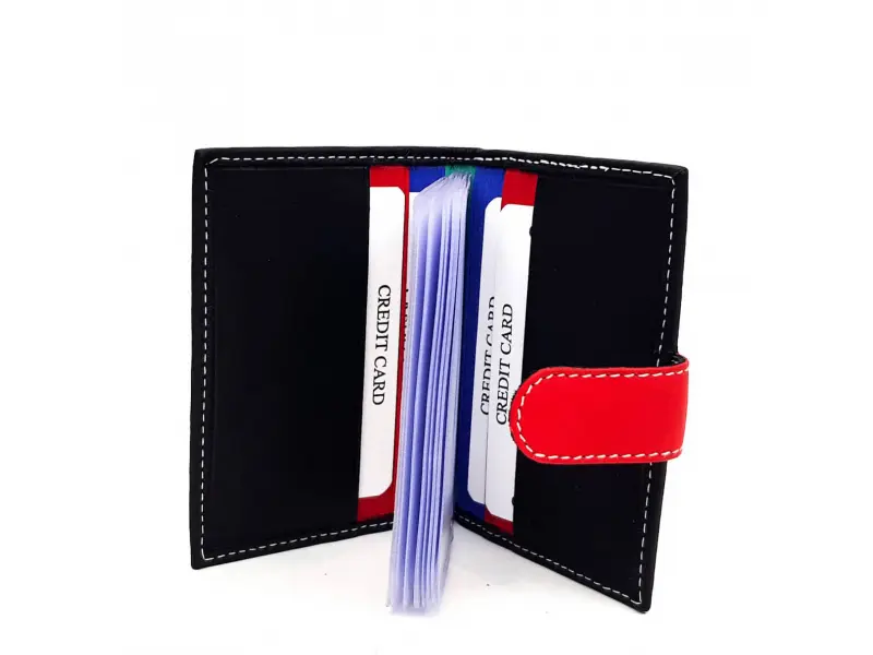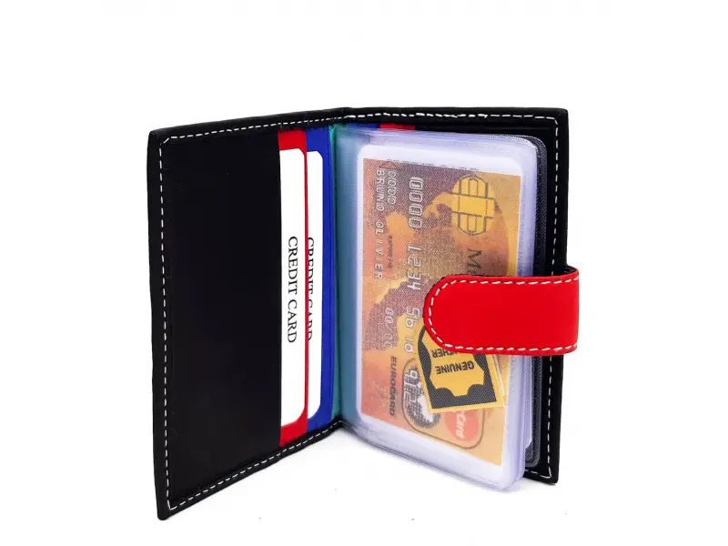 Качествена естествена кожа мека и приятна на допир. Черен удобен и тънък визитник с щампа и червена закопчалка. Слотове за карти и визитки ,визитник в здрава и качествена кожа.