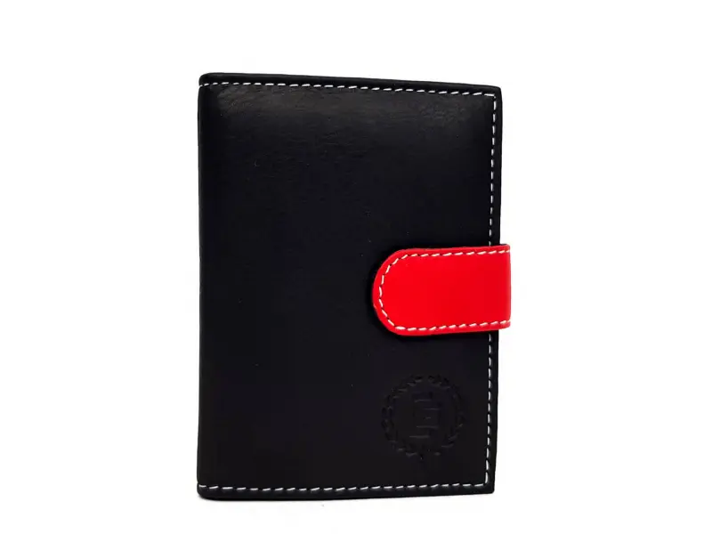 Визитникът има червена закопчалка, която осигурява сигурно затваряне.