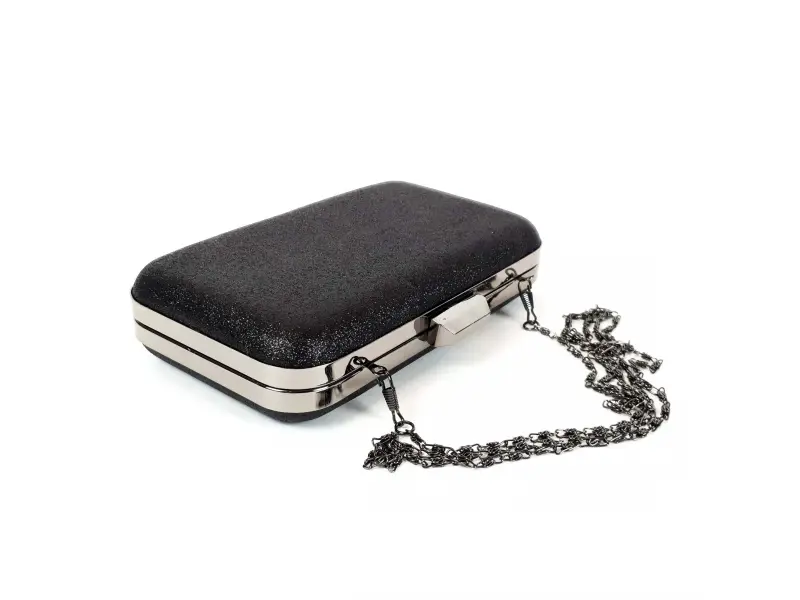 Стилна малка черна чанта със сребърен кант и верижка, едно отделение отварящо се с механизъм. Малка черна чанта подходяща за официална чанта, вечерна чанта или бална чанта.