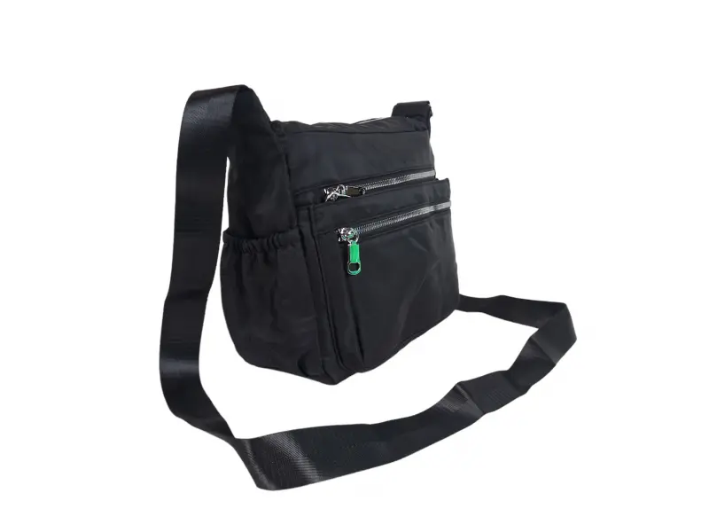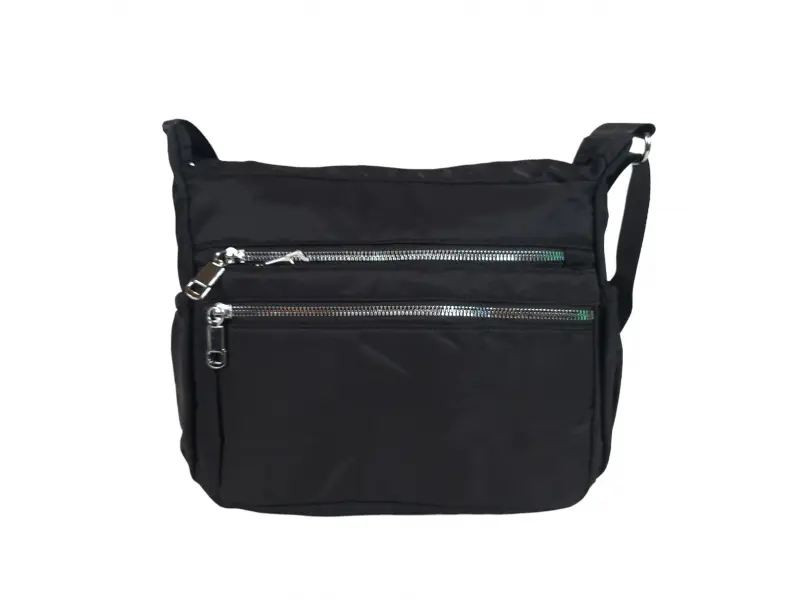 Дамска чанта от текстил с много отделения - Дамска чанта от текстил. - Едно основно отделение с цип. - Малък вътрешен джоб с цип. - Отделение за телефон и документи. - Три предни джобчета с цип. - Заден джоб с цип. - Два странични джоба. - Регулираща се, дълга дръжка.