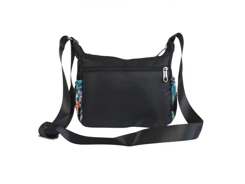 Ежедневна дамска чанта - Дамска чанта от текстил. - Едно основно отделение с цип. - Две предни джобчета с цип. - Заден джоб с цип. - Два странични джоба. - Малък вътрешен джоб с цип. - Регулираща се, дълга дръжка.