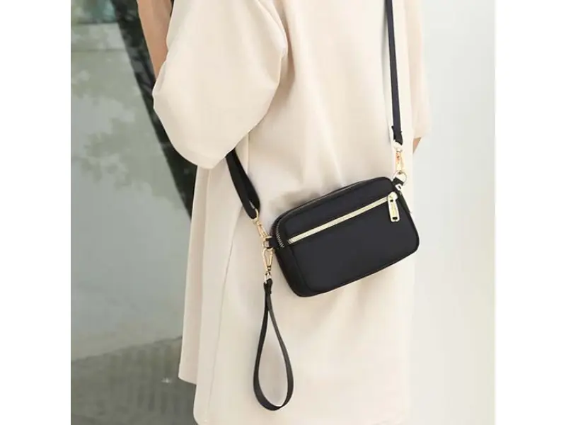 Ежедневна малка дамска чанта - Малка дамска чанта от текстил. - Три основни отделения с цип. - Предно джобче с цип. - Заден джоб с цип. - Удобна дълга регулираща се дръжка. - Дръжка за носене в ръка.
