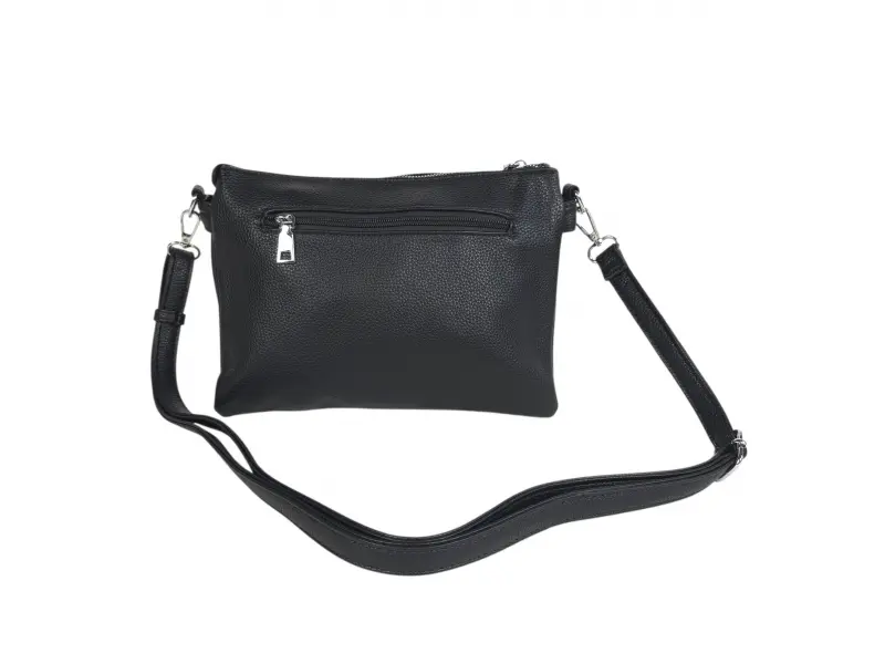 Модерна дамска чанта в черен цвят - Малка дамска чанта от еко кожа. - Две основни отделения с цип. - Вътрешен джоб с цип под основния цип. - Два джоба без цип под основния цип. - Малък вътрешен джоб с цип. - Отделение за телефон и документи. - Заден джоб с цип. - Регулираща се дълга дръжка.