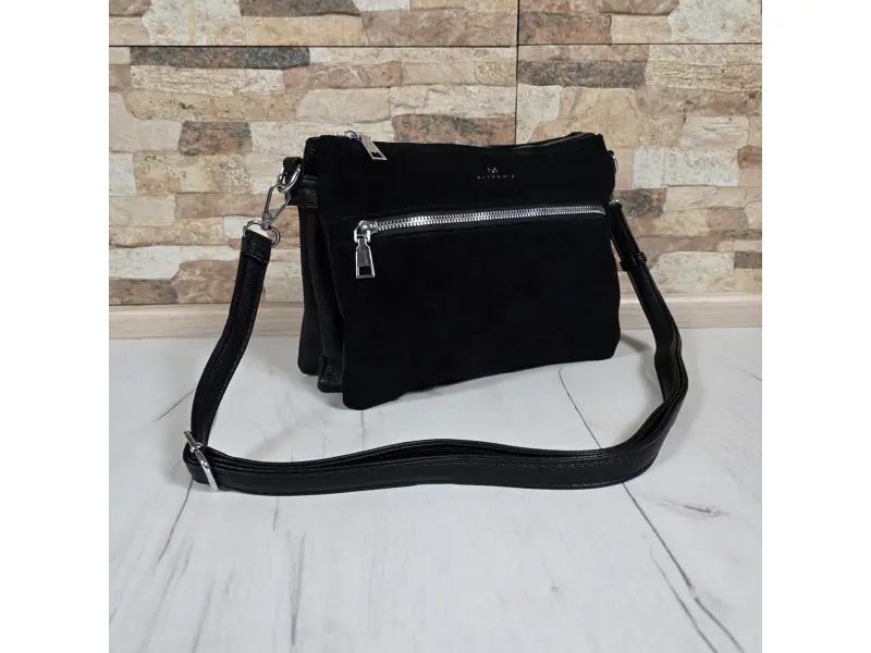 Малка дамска чанта от качествена еко кожа и велур. Удобна дамска чанта с интересен дизайн и удобна дълга регулираща се дръжка в калсически черен цвят.