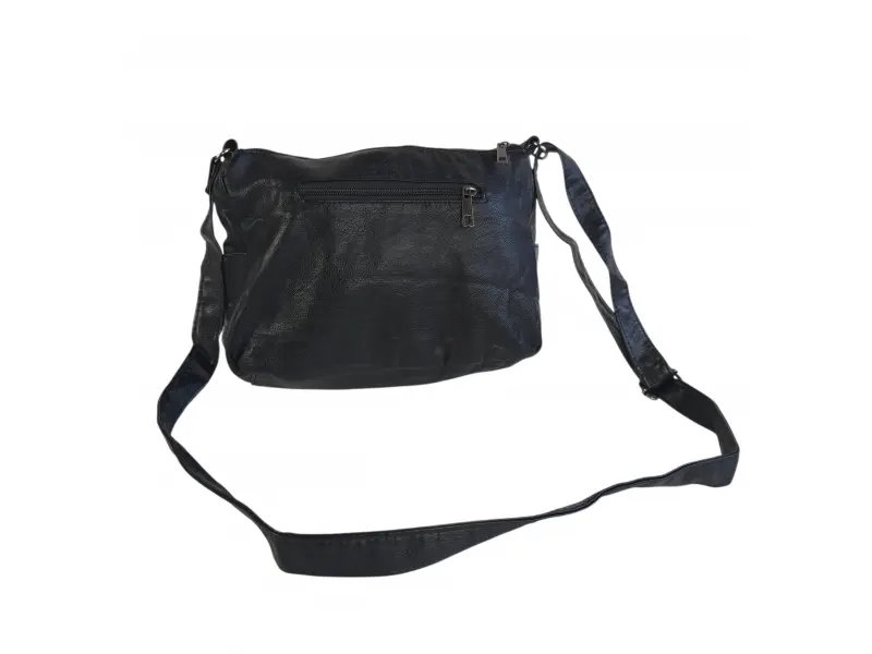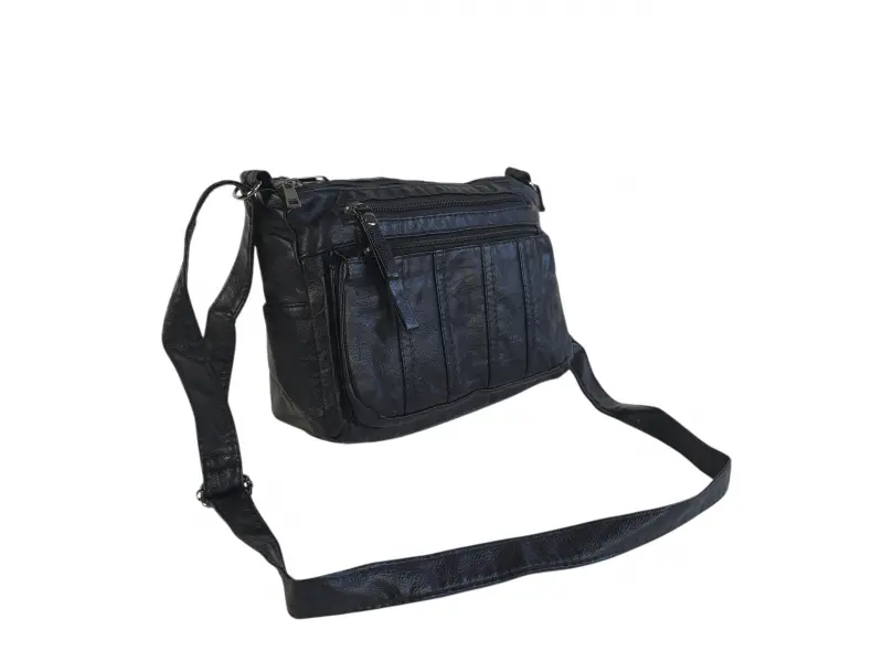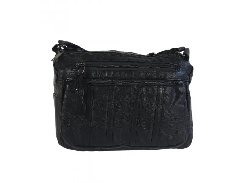 Мека на допир дамска чанта - Дамска чанта от изкуствена кожа. - Две основни отделения с цип. - Малък вътрешен джоб с цип. - Два предни джоба с цип. - Два странични малки джоба. - Заден джоб с цип. - Удобна дълга регулираща се дръжка.
