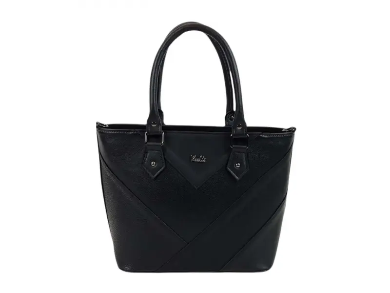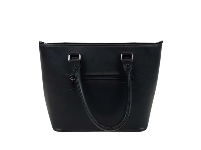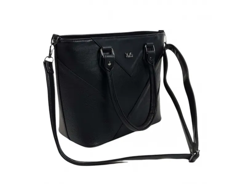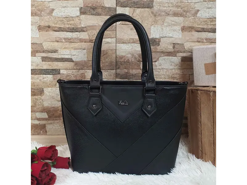 Черна дамска чанта от качествена изкуствена кожа, произведена в България. Ежедневна чанта с едно голямо отделение разделено на две от отделение с цип, малко вътрешно джобче с цип, отделение за телефон и документи, заден джоб с цип. Дамска чанта удобни дръжки за носене и допълнителна дълга регулираща се дръжка.