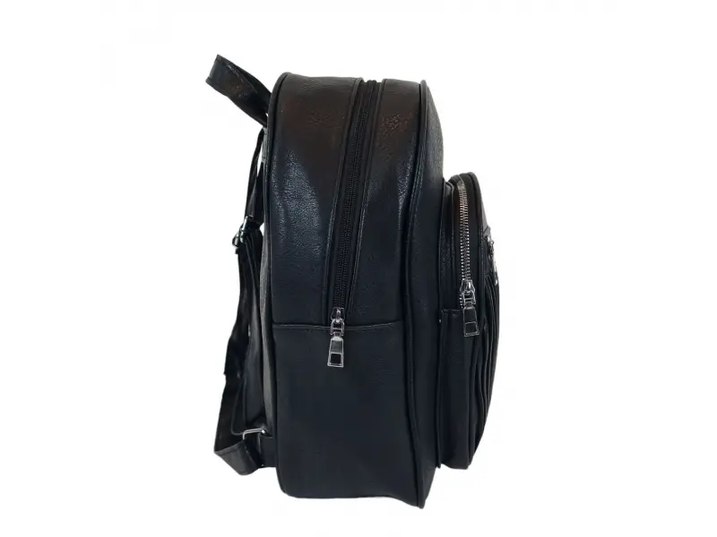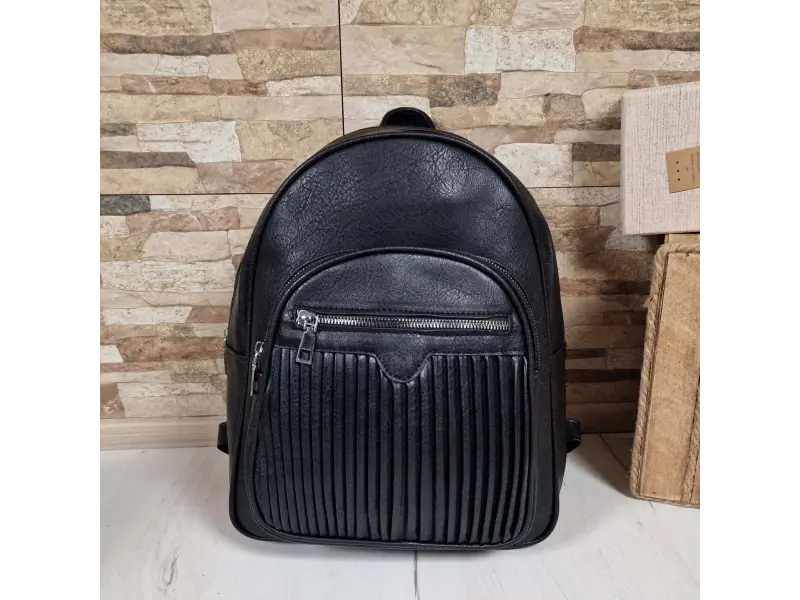 Удобна дамска раница в черен цвят - Дамска раница от еко кожа. - Едно голямо отделение с цип. - Вътрешен джоб с цип. - Два предни джоба затварящи се с цип. - Регулиращи се презрамки.