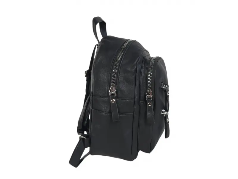 Удобен модел дамска раница - Дамска раница от еко кожа. - Едно основно отделение с цип. - Вътрешен джоб с цип. - Отделение за документи и ключове. - Три предни джоба с цип. - Заден джоб с цип. - Дръжка за носене в ръка. - Регулиращи се презрамки.