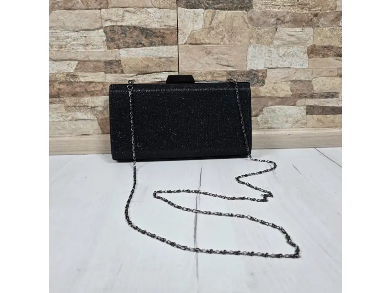 Стилна дамска чанта за официално събитие - абитуриенски бал, сватба. Голяма елегантна чанта в черен цвят с едно отделение с механизъм и дълга дръжка тип верижка.