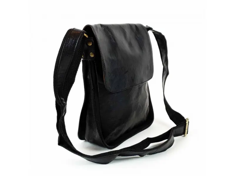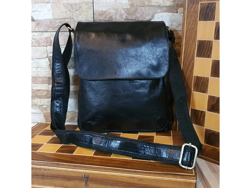 Качествена мъжка чанта от естествена кожа. Черна мъжка чанта с магнитно закопчаване, едно основно отделение с цип и вътрешно малко джобче с цип, предно отделение без цип, заден джоб с цип. Удобна мъжка чанта с възможност за увеличение на обема и регулиращи се дръжка от полиестер и кожа.