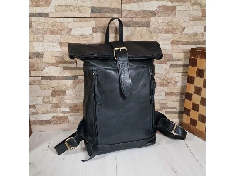 Голяма раница от естествена кожа - Раница от качествена естествена кожа. - Едно основно отделение затварящо се с цип и кожен колан. - Вътрешен джоб с цип. - Два предни джоба с цип. - Заден джоб с цип. - Дръжка за носене в ръка. - Регулиращи се презрамки.