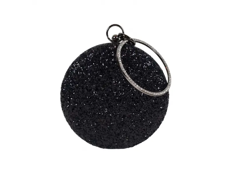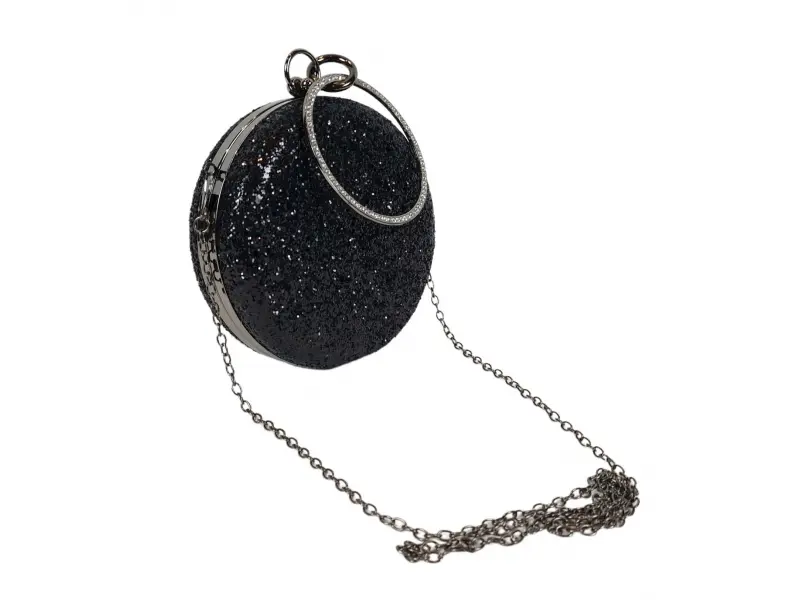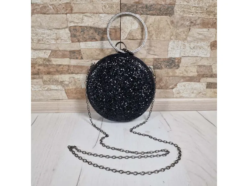 Кръгла дамска чанта за специално събитие - Официална дамска чанта с едно отделение. - Отваряне и затваряне с механизъм. - Метален кант. - Дръжка за носене в ръка. - Дълга дръжка тип верижка.
