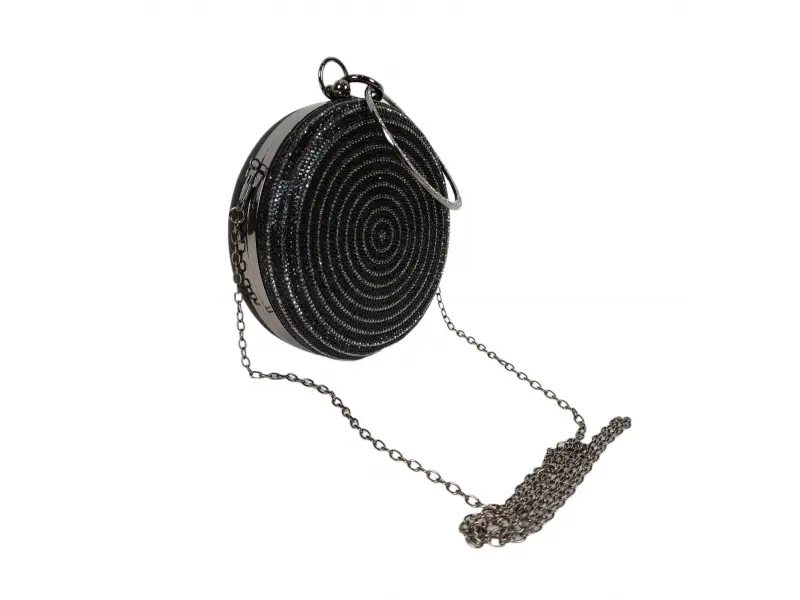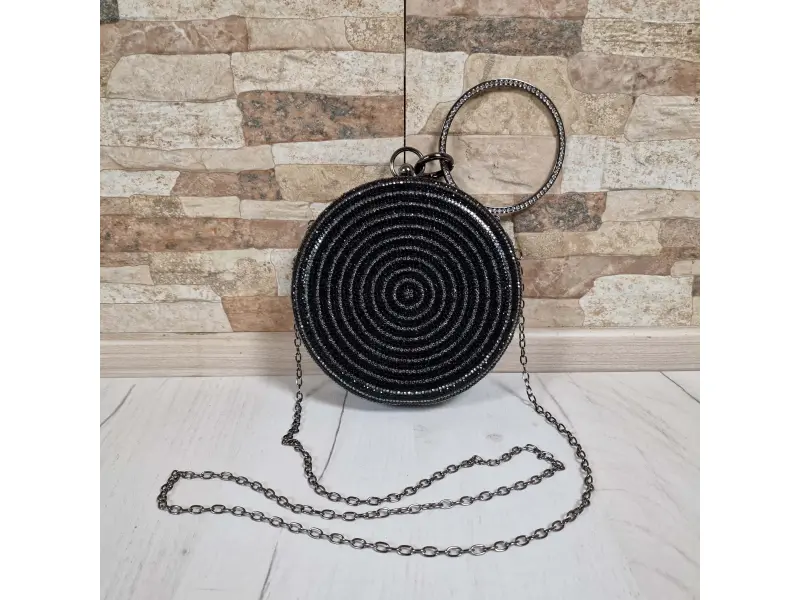 Модерна дамска чанта в кръгла форма - Официална дамска чанта с едно отделение. - Отваряне и затваряне с механизъм. - Метален кант. - Дръжка за носене в ръка. - Дълга дръжка тип верижка.