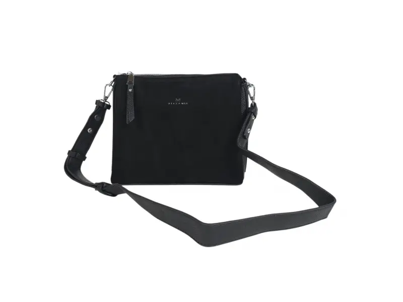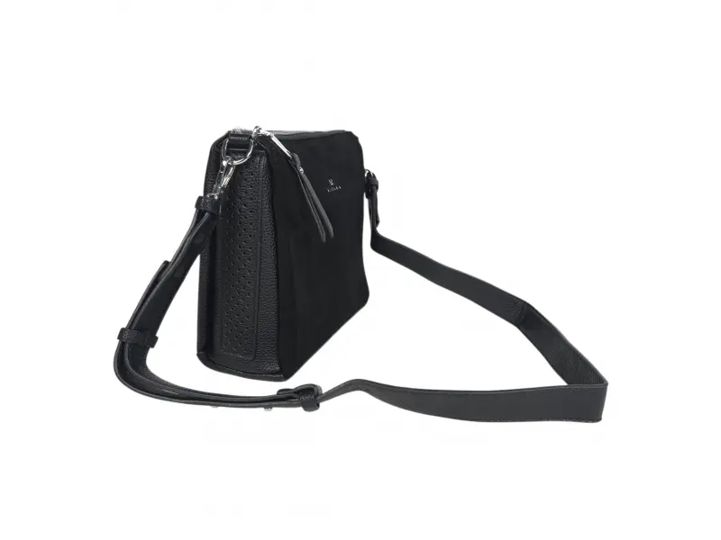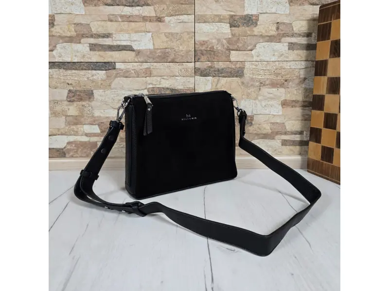 Малка дамска чанта от качествена еко кожа и велур. Удобна дамска чанта с интересен дизайн и удобна дълга регулираща се дръжка в калсически черен цвят.
