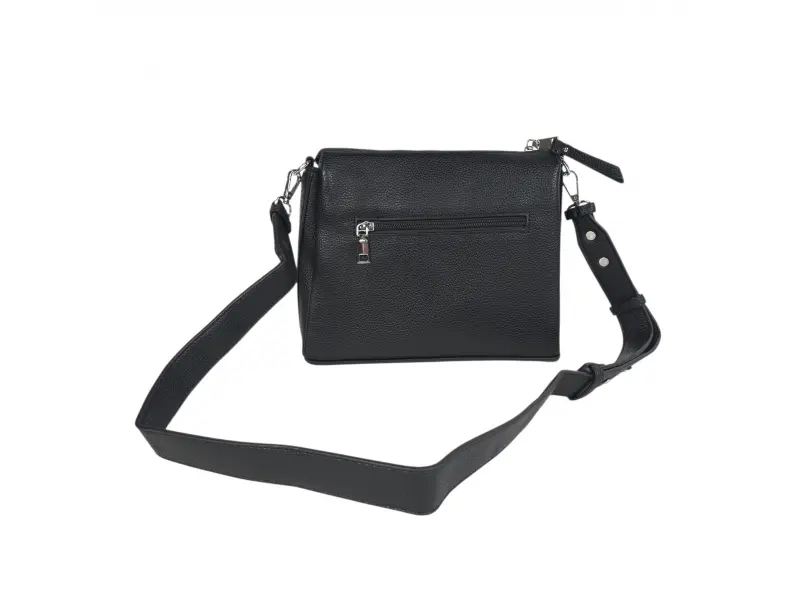 Актуална дамска чанта в черен цвят - Малка дамска чанта от еко кожа и велур. - Три основни отделения затварящи се с един цип. - Вътрешен джоб с цип. - Отделение за телефон и документи. - Заден джоб с цип. - Регулираща се дълга дръжка.
