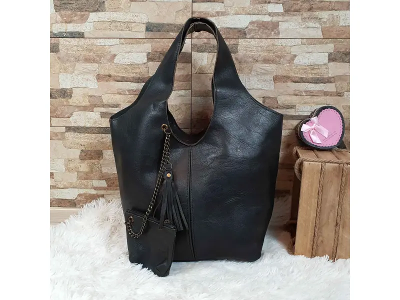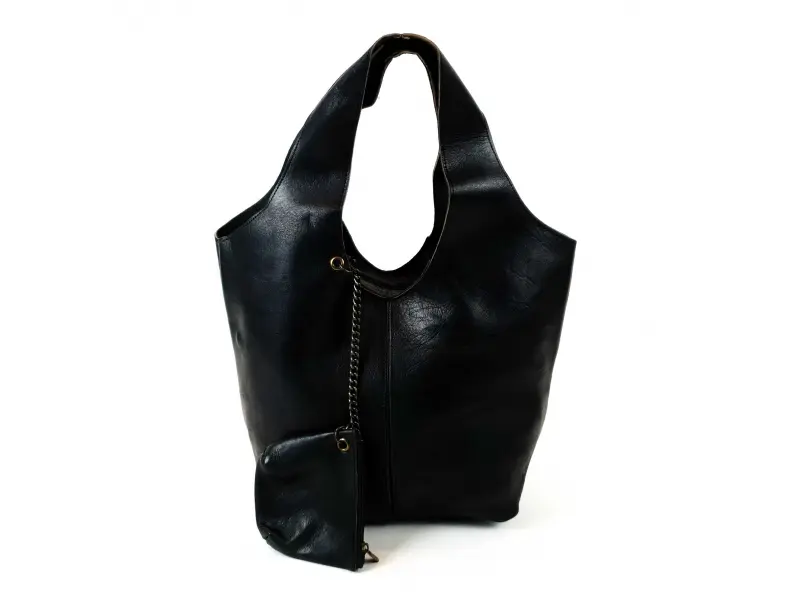 Голяма дамска чанта тип торба от естествена кожа, ръчно обработена. Мароканска черна чанта - торба с магнитно закопчаване, със здрави дръжки и допълнително портмоне с цип.